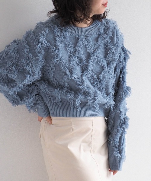 主役になる事間違いなし!!フリンジデザインニット登場 ◇Point◇ 毛足の長いフリンジが特徴的なデザインニット。 トレンドの着丈短めで様々なボトムとの相性も◎ 身幅は体のラインを拾わずゆったり着用できるもの魅力的。 ◇Material◇ 様々な毛足のフリンジニットで肌触りも優しく柔らかい質感。 ※着用時や周囲の粗いものとの引っ掛かりに十分ご注意ください。 ◇Coordinate◇ コンパクトな着丈ではあるもののボリューム感のあるデザインなのでボトムはシンプルなものがオススメ。 カジュアルにデニムやスラックス、メンズライクなボトムでハンサムスタイルが完成。 ツルっとしたサテン素材やストンとしたシルエットのボトムを合わせればレディーでオシャレなスタイリングも叶います。 ※照明や天候により実際の色味と異なって見える場合がございます。ご了承くださいませ。
