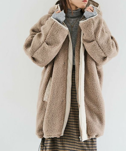 もこもことした手触りが魅力のボアコート。 配色デザインで抜け感があり、大人カジュアルなスタイルが叶います。 ゆったりとしたオーバーサイズで中に着込みやすいサイズ感。 厚手のニットを合わせてもごわつかずに着ていただけます。 内側も袖口までキルティング仕様で暖かさも◎ ヒップラインがすっぽりと隠れる着丈で暖かくボトムスを選ばないのも嬉しいポイント。 合わせるアイテムを選ばずに着回せる万能アイテムです。 裾はドローコードで絞ってシルエットを変えた着こなしも楽しめます。 ポケット付きで実用性があるのも嬉しいポイントです。 もこもことしたボリューム感のある生地。 暖かみのあるボアと裏地にはキルティング素材を使用し保温性にも優れています。