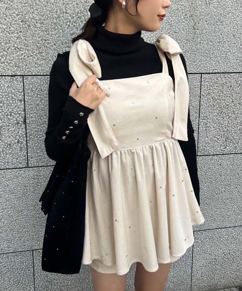 ~NICECLAUP 2023 winter Collection~ 今期トレンドのビジューが散りばめられた着映えするアイテム。 肩のリボンは長さ調節にもなり、ナイスクラップらしいフェミニンな印象をプラスします。 後ろがゴムの仕様なので伸縮性がしっかりあるので着やすさ◎ 腰回りが隠れる丈感なので、ウエストや腰回しをカバー。 インナー次第で通年使えるので長い季節お楽しみ頂けます。 肩のリボンは取り外し可能なのでシンプルな状態でも着用可能。 ■オススメスタイリング 暑い日は一枚でヘルシーに着るのはもちろん、 Tシャツやハイネックニットなどを合わせたレイヤードコーデで印象を変えられます。 シャツや、カーデガンを羽織って合わせてお使いいただけます。 ボトムスはデニムやラインパンツなどと合わせるとよりトレンド感のでるスタイリングになります。 ------------- 裏地: あり 伸縮性:背中ゴムあり 生地の厚さ:普通 生地の重さ:普通 洗濯 :手洗い/ドライ ------------- ※サンプルでの撮影のため、実際のものと仕様や色が異なる場合があります。 ※室内、室外での撮影のため実際より明るく映っていたり、暗く映っていたりする場合がございます。 ※品質表示を必ずご確認下さい。 【商品のお気に入り登録】 完売カラーの再入荷や、ラスト1点のお知らせ、セールの通知を受け取ることができます。 【ブランドのお気に入り登録】 新作入荷や再入荷情報など、ブランドの情報をいち早くお届けします。 ぜひご登録ください♪