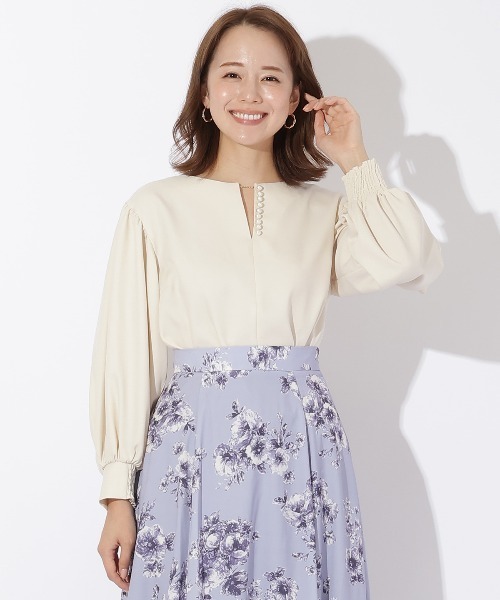 【デコルテのパールとチェーンが煌めくブラウス】【Design/Styling】オフィスシーンからお出かけのシーンまで幅広く活躍するブラウス。ボリューム袖のゆったりシルエットにデコルテのV開きで抜け感を演出。後ろファスナータイプで着用いただけます。ボリューム袖のブラウスにはハイウエストのアイテムとの相性がよく、メリハリのあるスタイリングがおすすめ。【Fabric】柔らかな素材で着心地もよく、きれい見えするマテリアルです。M:(02):着丈60cm 身幅48.5cm 肩幅45.5cm 袖丈52.3cm