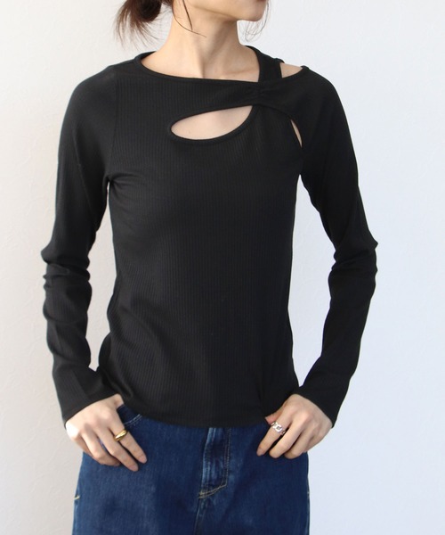 ■カットアウトリブプルオーバー 【デザイン】 カットアウトにアシンメトリーな肌見せがヘルシーに見せてくれる トレンド感たっぷりのデザインプルオーバー。 さらっとしや肌触りと高い伸縮性にこだわった素材を使用。 さり気ない肌見せが叶うので大人の方にもオススメの一枚。 着るだけで旬なスタイルが完成するのも嬉しいポイント。 【スタイリング】 一枚でスタイリングがトレンドライクにアップグレード。 ボトムスを選ばずINスタイルでもスッキリ決まります。 ジョガーパンツやワイドパンツで 旬な大人カジュアルを叶えます。 -------------------------------------- 透け感:なし 裏地:なし 伸縮性:あり ケア方法:手洗い可能 ※お洗濯の際は洗濯表示を必ずご確認ください。 --------------------------------------