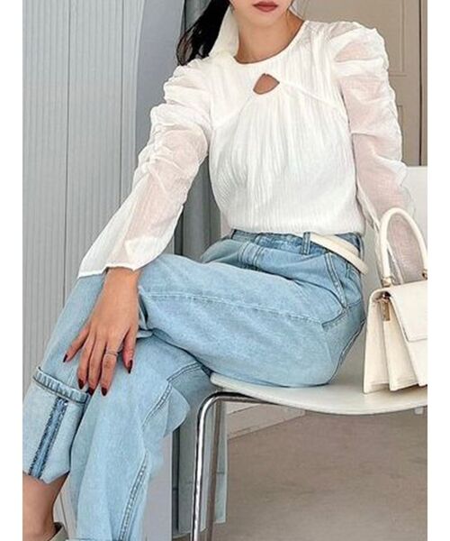 デザインやシルエットにこだわったブラウス ▽デザイン▽ 表面感ある生地を使用したトレンド感あるブラウス。 袖口のスリットやバスト上の開き見せデザインで 女性らしさのある抜け感を出しました。 袖山にはギャザーをたっぷり寄せボリュームスリーブに したところもポイントです。 袖は透け感があるのでシーズンムードを高めてくれます。 ▽カラー▽ 無地の白・黒・ミントとドット柄の4色展開。 ▽スタイリング▽ ボリューム感のあるブラウスなので タイトシルエットのボトムと合わせるのがオススメ◎ キレイめな印象のブラウスなのでデニムアイテムや ショートパンツ合わせでトレンド感のあるスタイリングに。