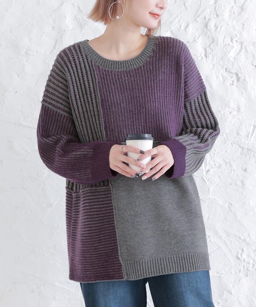 パッチワークのように切り替え、配色バランスにもこだわった他にはない印象的なニット。ゆるっとシルエットでボトムスやインナーを選ばず、レイヤードスタイルも楽しめる一着。 縦編み仕様で立体感のある、ふんわりあたたかいバルキーニットを使用。 2色の糸を同時に引き入れながら編んだ"二重臼ニット"で色合いにニュアンスをプラス。 ≪ n'OrLABEL ≫2重臼ミックスニットです。 ニット製品につきまして。 ニット製品は、身体に自然と馴染む伸縮性が特徴となります為、 編み上げる行程やプレス仕上げによって多少サイズや風合いの個体差が生じる場合がございます。 また、着用の際ピリングが避けられず、完全に防止することはできません。 ピリングができましたら、引っ張ろうとせずハサミや毛玉取り器で丁寧に取り除いてください。 ニット素材の持つ特性となります為、ご了承の上ご購入いただきますようお願いいたします。 ローゲージニットにつきまして。 やわらかな糸を数本合わせて編むことにより、独特のざっくりした風合いを出しております。 先の尖ったものや、ざらついたものに引っかかり、糸が飛び出すことがございますので着用時にご注意お願いいたします。 組織の特性となります為、ご了承の上ご購入いただきますようお願いいたします。