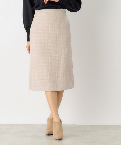 モールツィードが上品なタイトスカート 【素材】 ・モール糸を使った起毛感のあるツイード素材を使用 ・モール糸特有の表面感と暖かみのある素材感も特徴 ・マシンウォッシャブル機能付きで、ご自宅で簡単にお手入れしていただけます。 ※裏地あり 【デザイン】 ・長すぎないシンプルなタイトスカート型で、モール糸を使ったツイード素材にラメ混なので、上品で華やかな印象 ・サイドの斜めのスリットポケット付きなのも嬉しいポイント ・センターバックにゴムが入っているので、ウエストに優しくフィットしてくれ、調節も可能で楽に穿いていただけます。 ※ポケット数:前×2 モデル情報:身長166cm 着用サイズ:38(M) 店舗へのお問い合わせ商品番号:C58-77023 ●製品寸法: 36(S):W60~62cm H86cm 総丈67cm 38(M):W63~65cm H88cm 総丈68cm 40(L):W66~68cm H90cm 総丈69cm 42(LL):W70~72cm H92cm 総丈70cm 備考: