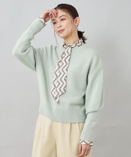 【デザイン】 レッグオブマトンスリーブ風のボリュームある袖が特徴のプルオーバー。 コンパクトなサイズ感のシンプルな身頃に、袖の上側にボリュームを出し肘から下は細めのストレート袖なので、 パフスリーブとは違い、ブラウジングしていただくと袖のボリュームが下側に溜まらないすっきり見えする新鮮なバランスに。 お袖の分量感やボリュームを出す位置に拘った袖コンシャスで着映えする一枚。 【素材感】 軽くスポンディッシュな膨らみがあり、暖かくソフトな風合いが特徴の毛100%のTOP紡毛糸。 【着こなしポイント】 光沢感のあるパンツ(商品番号:153-67600)やワイドパンツに合わせた甘辛なスタイリングや、 ボリュームスリーブトップスにはナローなタイトスカートや細身のパンツを合わせて、トップスに重心を置くとすっきりとしたバランスで着こなしていただけます。 モデル情報:身長161cm B79 W58 H86 着用サイズ:02(M) 店舗へのお問い合わせ商品番号:153-17654 ●製品寸法: 00(XS):着丈49cm B95cm 袖丈51cm 肩幅47cm 02(M):着丈52cm B103cm 袖丈52cm 肩幅51cm 04(2LT):着丈56cm B109cm 袖丈53cm 肩幅54cm 44(3L):着丈55cm B117cm 袖丈52cm 肩幅56cm 48(5L):着丈55cm B125cm 袖丈51cm 肩幅60cm 備考: