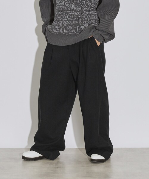 【素材】肉厚で起毛感のあるTR素材を使用。ドレープが美しく生まれるので、歩いたり腰かけた際に様になるのもポイントです。※裏地なし【デザイン】極端にワイドに作ったスラックス。起毛感があり裾が靴に被る長さに設計しているためキレイ目だけでなくカジュアルなファッションにも合うアイテムです。ウェストには平紐が入っており、スウェットのようにぎゅっとウェストを絞って履く事が出来ます。ポケットにスマホや財布を入れる際にパンツがずり落ちる気苦労が軽減され快適な履き心地です。※ポケット数:前×2、後ろ×2- BRAND CONCEPT -時代を超えて支持されるトラディショナルなアイテムをベースに、アソビ心とストリートの自由な発想を取り入れ、日本独自のミックススタイルを提案します。【気になる商品はお気に入り登録をおススメ】▼商品のお気に入り登録完売しているカラーの再入荷通知や、ラスト1点、セールの通知をお知らせいたします。▼ブランドのお気に入り登録新商品や再入荷など、いち早くブランドの情報を受け取ることができます。モデル情報:身長160cm B75 W54 H80 着用サイズ:66(FREE)店舗へのお問い合わせ商品番号:P97-77116●製品寸法:66(FREE):W~76cm H100cm 股下70cm 前股上34cm 渡り幅36cm 裾幅28cm備考: