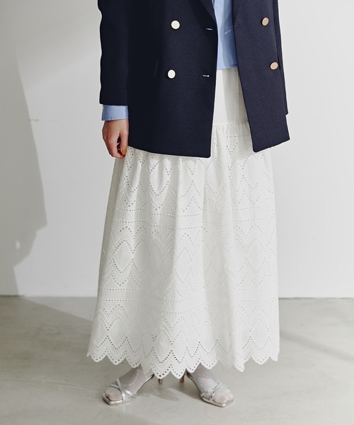 春夏スタイルに合うコットンレース素材で仕立てたフレアスカート。腰まわりをすっきりまとめ、裾に向かって刺しゅうをあしらったデザインが魅力。ウエストの脇から後ろにかけてゴム入りなので、おさまりが良くなっています。ボーダートップス、カジュアルなスウェット合わせがお勧め。レースの形に合わせた、裾のカッティングも華やかでありながら、足もとを軽快に見せてくれます。●取り扱いについては、商品についている品質表示でご確認ください。●撮影はサンプル商品で行っている為、仕様とサイズが異なる場合がございます。●スタジオ及び屋外で撮影した着用画像は、光の当たり具合やご覧のモニターによって色味が違って見える場合があります。予めご了承ください。●生産時期により色・素材・サイズ感など多少異なる場合がございます。予めご了承ください。≪お買い物をよりお楽しみいただくために≫・「商品のお気に入り登録」再入荷通知や、ラストの通知、セール通知も受け取ることができます。・「ブランドのお気に入り登録」新商品や再入荷など、お得な情報を受け取ることができます。