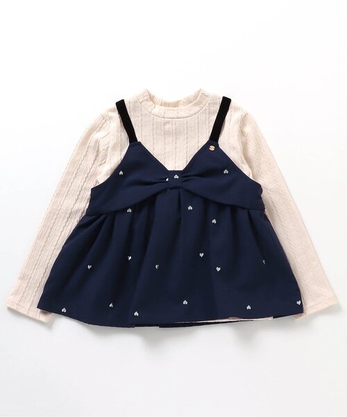 ケーブル柄のトップスに スウェード素材のリボンビスチェがついたドッキングトップス。 ラメ糸でハート刺繍がされており 肩リボンはベロア素材で特別感たっぷり♪ 別売りの裾スカラップショートパンツと セットアップも可能です◎ クリスマスパーティーのおめかし服や お出かけにも使いやすい◎ セットアップにできるショートパンツはこちら >>V523023 ハート刺繍スカラップショートパンツ 【取り扱い表示】 40℃を上限に洗濯機で洗濯、デリケートアイテムモード、ネット使用、漂白剤禁止、色物は同系の色と一緒に、洗濯後直ちに取出し、タンブル乾燥不可、日陰で吊り干し、アイロン禁止、商業ドライクリーニング不可 【ご注意事項】 この商品は着用中の摩擦や洗濯により毛羽の乱れ、毛羽脱落、毛玉が生じることが有ります。できるだけ美しくご利用頂く為に次のことにご留意下さい。 ○毛玉は毛玉取り器またはハサミで丁寧にカットして下さい。 ○毛羽が他に付着した際はテープやブラシで除去して下さい。 ○他の製品とは洗わず、単独でお洗濯して下さい。 ○タンブル乾燥はお避け下さい。 この商品はスリット糸(ラメ糸)を使用しています。 素材の特性上、着用時にスリット糸(ラメ糸)が肌に触れると刺激を感じる事があります。肌の弱いお子様は購入をお避け下さい。また、保管中に変色する場合がありますので、次の事にご留意下さい。 ○保管中は他の毛、絹、ゴム製品との接触はお避け下さい。 ○汗や汚れを付着させたままの保管はお避け下さい。 ○防虫剤をご使用の際は、取り扱い表示をよく読み、衣類に直接触れない様に保管して下さい。 ※商品により多少の誤差が生じる事がございます。あらかじめご了承下さい。 ※ご使用のパソコンやブラウザの環境により、実際の色とは多少異なる場合がございます。 ※モデル着用写真についてはイメージの為、実際の商品とカラーや仕様が異なる場合がございますので、商品画像をご覧ください。 【 apres les cours -アプレレクール- 】 「キオク いろどる、こどもふく。」 大切なキオクを彩る、お気に入りの一枚。 「アプレ レ クール」は独自の色づかいやテキスタイルで日々をトクベツに過ごせる そんな「一枚」をお届けします。