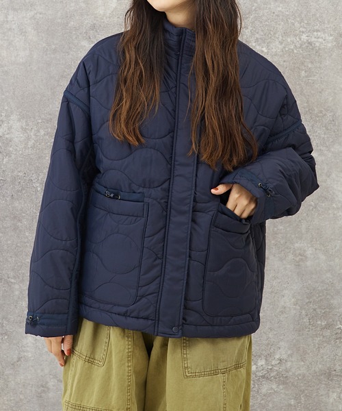 ■こなれ感あるかっこよさ、キルティングブルゾン ぽわんとしたひょうたんキルトで、旬なミリタリーテイストに仕上げたキルティングジャケット。 つなぎ目に施したパイピングが、スタイリングにアクセントをプラスしてくれます。 袖口と裾周りのドロストで、お好みのフィット感で簡単にシルエットチェンジが可能です。 物が落ちづらいアジャスター付きのポケットをセッティングし、機能性が高く実用的にも優れたデザインに。 ファスナー部分には前立てをつけ、フロントボタンも施すことで冷たい風の侵入を防いでくれる、防寒対策もばっちりなミリタリージャケットです。 ■首まですっぽりあたたか、ハイネック 首元はやや立ち上がるスタンドネックになるよう計算され、防寒と同時にトラッドな雰囲気やモード感を演出。 大胆に肩を落としたドロップショルダーが、ラフな印象を与えて自然と体に寄り添います。 ボディラインをはっきりさせないビッグシルエットは、厚手のトップスとも重ね着しやすく、トレンドを押さえた今年らしい1枚です。 さらさらとした裏地付きで、重ね着をしてもかさばりづらく、摩擦や引っ掛かりを減らしてくれるので、中のトップスが毛玉になるのを防ぎます。 程よくヒップを隠してくれる絶妙なミドル丈のバランスが、どんなボトムスとも相性よくコーディネートに取り入れやすいです。 ■防寒対策も◎!中綿キルティング あたたかな空気を含んでキープしてくれる中綿は、着た瞬間から安心感が体を包み込んでくれます。 繊維が密に詰まった独特の風合いで、軽量でありながら頑丈さも兼ね揃えているリップストップナイロンを使用しました。 高密度に織られているため耐久性に優れており、マットな質感がメンズライクなかっこ良さを引き出します。 独特のハリ感がシルエットを綺麗にキープしてくれるので、アウターにぴったりな素材です。 ■透け感/なし ■伸縮性/なし ■張り感/あり ■裏地/あり 《お気に入り登録》でお得な情報を受け取れます! ・「商品のお気に入り登録」で再入荷通知や、セール通知を受け取ることができます。 ・「ブランドのお気に入り登録」で新商品や再入荷など、お得な情報を受け取ることができます。 ※モニター・環境等により実際の商品と多少色味が異なって表示される場合がございます。予めご了承をお願い致します。 【アイテムカテゴリ】 キルティングアウター 羽織り ライトアウター ミリタリーアウター ミリタリーブルゾン 秋アウター 冬アウター 無地アウター ジップアップブルゾン ジップアップジャケット 【デザイン】 ポケット付き 配色 【シルエット】 ビッグサイズ オーバーサイズ ルーズ 大きいサイズ ワイドシルエット ゆったり 大きめ 着心地 楽ちん 動きやすい ジャストサイズ Mサイズ ワンサイズ フリーサイズ マルチサイズ ワイド 幅広 体系カバー 二の腕カバー スタンド衿 スタンド襟 ミディアム丈 ロングスリーブ 長そで 長袖 フロントファスナー 前ファスナー ジッパー ジップ チャック ボタン開き 前開き 前ボタン 【生地・素材】 中綿キルト コットン混 綿混 暖かい あったかい 【カラー展開】 カーキ ネイビー グレージュ ナチュラル ホワイト 緑 紺 藍 白 灰色 単色 ミリタリーカラー くすみカラー スモーキーカラー 秋色 秋カラー 冬色 冬カラー 【ファッションテイスト】 女性 ウィメンズ 可愛い かわいい かっこいい お洒落 おしゃれ 大人 個性的 大人カジュアル カジュアルスタイル カジュアルコーデ カジュアルファッション アメカジ アメカジファッション 20代 30代 40代 50代 お誕生日 ギフト プレゼント おそろい 記念日 ママ 彼女 デイリー 着痩せ 普段着 出かけ着 着回し ペアルック デート お出かけ タウンユース デイリーユース アウトドアスタイル アウトドアファッション キャンプ スポーティファッション スポーツミックス レトロ 大人ナチュラル ストリートスタイル ストリートファッション ストリート系 スケータースタイル スケーターファッション ボーイッシュ キレカジ きれいめカジュアル 休日コーデ フレンチカジュアル レイヤードコーデ レイヤードスタイル 重ね着スタイル 【シーズン】 秋冬 春コーデ 秋コーデ 冬コーデ 春服 秋服 冬服 ロングシーズン