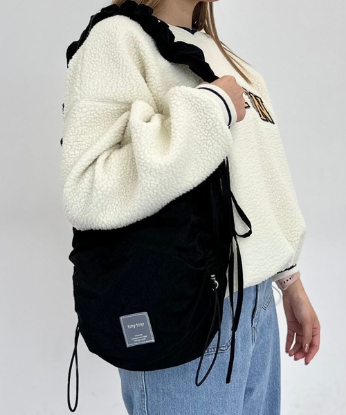 お好みのフォルムを楽しめるバッグ カジュアルにもフェミニンにも合わせやすい素材を使用した、軽量のショルダーバッグ。 長財布や500mlのボトルを収納できるサイズ感です。 外側・内側どちらにもポケット付き。 持ち手と本体がドロスト仕様になっており、調整することでお好みの長さでお使いいただけます。 短くするとギャザーがしゅくしゅっとし、フリルのようなデザインになるのがポイント! 【tiny tiny(ティニーティニー)】 Feminine convenience stand スタイリストは、じぶんがいい。 tiny tinyはフェミニンテイストの服飾雑貨が揃う セルフスタイリストのためのコンビニスタンド。 コンパクトだけどたくさんの「好き」が詰まった空間で、立ち寄るといつも新しい「自分」のヒントがもらえる。 タイニーな「好き」の積み重ねが 毎日をハッピーに変えてくれる。 たったひとりのわたしらしさを作ってくれる。 今日も tiny tinyに寄って行きませんか?