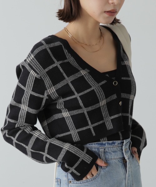 (fabric&design) レーヨン混の糸を使用しているのでもちっとした肌ざわりが気持ちいい一枚です。 カーディガンはコンパクトな体に程よくフィットするサイズ感です。 V開きの形はデコルテが綺麗にすっきり見せてくれます。 柄はシンプルな色のチェックで着やすいです。 (styling) キャミトカーディガンのセットなのでアンサンブルで着ていただくのがおすすめです。 カーディガンを閉めて一枚着トップスのように着ていただいても可愛いです。 フェミニンなやわらかい配色なのでミニスカートにロングブーツ合わせなどでフェミニンコーデにしても◎ あえてデニムでカジュアルダウンしても大人っぽく着られるのでおすすめです。 ■透け感:なし ■生地の厚さ:厚手 ■裏地:なし ■伸縮性:あり ■光沢:なし ■シルエット:スモール 【キャミソールサイズ】総丈:42cm/バスト:65cm/肩ひも(調節可):43cm ------------------------------------------------------ ◆商品のお気に入り登録◆ お気に入りアイテムの値下げ・再入荷・在庫1点などの通知を受け取ることができます。 ◆ブランドのお気に入り登録◆ 新商品や再入荷、セール、クーポン配布などお得な情報を受け取ることができます。 ------------------------------------------------------