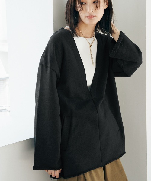 Vネックが深めに開いた縦長ラインのあるディープVネックスウェット。 カジュアルになりがちなスウェットを女性らしさを含めてデザインしました。 “とろみ”まではないですが、ほんのりとハリ感を残したやわらかいスウェット生地を選んですっきりとした着膨れないラインに仕上げています。 厚みは適度にあってモデルさんのように中をキャミソールにすると晩夏や秋口、初夏などの季節の変わり目に。ブラウスやシャツを合わせるのもおすすめです。 中に着るものをハイゲージのニットやシアー素材の暖かい薄手のニットを合わせると11月〜2月頃の真冬の時期にも。 プルオーバーなので着用時もとても楽。ストンとしたラインが出てスタイルカバーもしてくれますよ。(ヒップも隠れる着丈です!)ハリ感もある程度あるので体のラインや凹凸をカバーしてくれるのもスタイルカバーのポイントになっています。 すらっとしたシャープな深Vネックが胸元をすっきり見せてくれるのでしっかりと胸がある方にもおすすめです。 ※袖口、裾、Vネック部分はカットオフ仕様となっております。こちらはお洗濯等で角が取れ丸みを帯びて女性らしい雰囲気と抜け感を表現するためのデザインとなっております。切りっぱなしが苦手な方はご注意ください。 [着用時期]真夏以外のオールシーズン [透け感]なし※Vネックが深いのでインナーは必須です [生地の厚み]中肉 [ストレッチ]あり [生地のやわらかさ]ほんのりハリ感のあるやわらかめ生地 [生地の特徴]裏毛(スウェット)素材 [落ち感]なし(ふんわりしたシルエット) [着用ジワ]袖や座った時のナチュラルなシワ [身長]全ての方に(身長によって着丈が変わります) ※感じ方には個人差がございますので気になる部分がありましたらお気軽にお問い合わせください