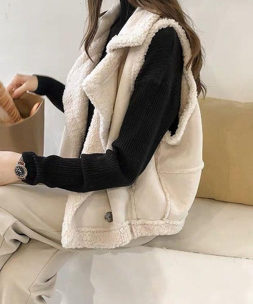 【商品説明】 内側部分がもこもこした毛並みのない プードルボアファーで 冬にぴったりのベストです。 ムートーン調の滑らかな肌触りで 高見えアイテムなデザイン。 ベストなので袖にデザイン性のある ブラウスやニットの重ね着にも おすすめです。 袖がないので春先まで愛用して頂けます。 両サイドにインポケットが付いて さりげなく便利。 さっと羽織るだけで華やか印象で 1枚あると重宝しそうな ムートン調のボアベストです。 ◇コーディネート◇ デニムなどカジュアルなスタイルから ワンピやドレスなどのエレガントな コーデの羽織りにもおすすめです。 ムートンブーツなどと合わせると まとまり感のある冬モードな 着回しができそうです。 【詳細】 ◇伸縮性…なし ◇裏地…なし ◇透け感…なし ◇ファスナー…なし ◇ポケット…あり ◇ボタン…あり(ホックタイプ) ◇付属品…なし ◇生地感…厚手 ◇素材感…ムートン調×もこもこボアファー ◇お気に入りブランドに追加をクリック ブランド最新情報やなどお知らせを受け取ることできます。 ◇商品のお気に入り登録→【カートに入れる】右側のハートをクリック 完売カラーの再入荷やラスト1点の通知セールの通知も受け取ることができます。 ※入荷時期によって生地生産ロット上色の濃淡の差異が生じる場合がございます。 ※撮影状況の光や撮影角度により実物とお色味が若干異なる場合もございますので予めご了承下さい。