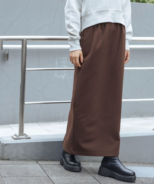 女性らしいシルエットが特徴のナロースカート。ウエストはゴム仕様で着脱もしやすく、細身のシルエットでも後ろにスリットがあるので足さばきがよいのもポイントです。【素材】程よい落ち感と伸縮性のあるカットジョーゼット素材のスカート。【スタイリング】ベーシックなアイテムなので、コンパクトなハイゲージニットからオーバーサイズのローゲージニットまでトップス選ばずに着用いただけます。