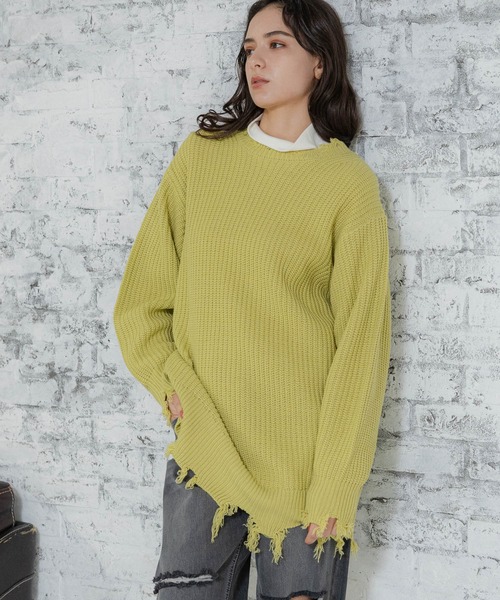 襟と裾部分にダメージデザインを施したニット。腰回りが隠れるチュニック丈でゆったりとしたオーバーシルエットな1枚です。からだのラインもひろいづらく、程よいダメージのデザインなので日常使いしやすいアイテムです。【素材】ざっくりと編まれたアクリル糸を使用した片畦編みニット。【スタイリング】合わせるボトムを選ばずスタイリングできるアイテムです。身頃や肩回りにゆとりのあるデザインなので、ハイネックインナーとのスタイリングも〇着丈が長めなので、コンパクトなボトムスやミニボトムとの合わせもおすすめ。