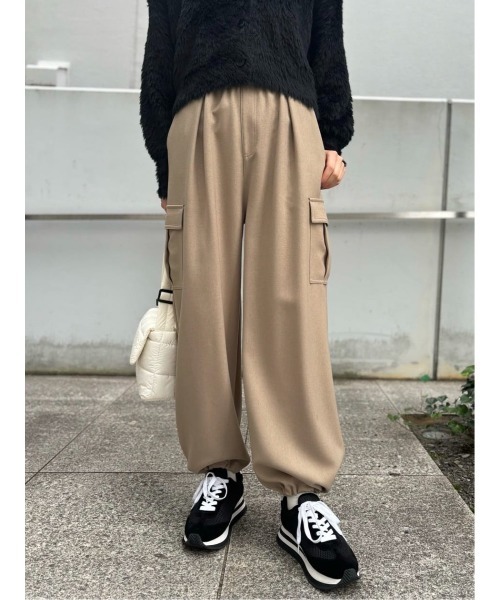 Design Point 太すぎないワイドシルエットとポケットがアクセントのストレッチカーゴパンツ。 今っぽい抜け感があるデザインです。 ウエストは総ゴム仕様でさらに内側にドロストも施すことで、サイズ調整がしっかりできるイージーな穿き心地。 裾のドロストでシルエットを絞る事ができ、2つのシルエットを楽しめます。 ※ポケット数:前×2、横×2、後ろ×2 Styling Point 合せるトップス次第で、カジュアルにもきれいめにもどちらにもスタイリングできるトレンドパンツ。 着るだけでモード感がアップする今年らしいアイテムです。 Fabric Point <LANATEC LEI/ラナテック レイ>というソフトな膨らみのある風合いが特徴のウール風素材。 シワになりにくく洗濯機で洗えます。 お手入れ簡単で肌触りが良く、日常に馴染むユーティリティー素材です。 ストレッチのツイル紡毛の様なザックリとした表情と膨らみが季節感をもたせます。 ※裏地なし 【生地詳細】 透け感:なし 伸縮性:ややあり 生地の厚み:普通 裏地:なし 洗濯方法:洗濯機洗い可 モデル情報:身長170cm B74 W58 H83 着用サイズ:38 店舗へのお問い合わせ商品番号:523-67013 ●製品寸法: 05:W62cm H93cm 股下59cm 前股上29cm 渡り幅30cm 裾幅26cm 36:W65cm H96cm 股下65cm 前股上30cm 渡り幅31cm 裾幅26cm 38:W68cm H99cm 股下66cm 前股上30cm 渡り幅32cm 裾幅27cm 40:W71cm H102cm 股下67cm 前股上31cm 渡り幅33cm 裾幅28cm 備考: