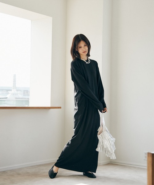 マキシ丈のカットソー素材のワンピース。 こちらは生地にこだわりが。 Tシャツ生地は薄手でさらっとしていて体に沿う落ち感のあるものが多いですが、こちらはラインをカバーできるように少しハリのある素材を選んでいます。 シルエットはIラインになるようにしてワンピースにありがちな甘さを削いで。 モードでクールめなカジュアルな印象になるようにデザインしていますよ。 着心地はカットソーなのでご想像通りとても楽な着心地。 軽くて肩が凝らず、合わせるアイテム次第で秋から春まで着ていただけます。 シンプルなので合わせる小物やシューズも選ぶ必要がなくデイリーに着ていただける1枚になっています。 トレンドというよりはベーシックで左右されない永遠の定番として。 長さにこだわりがあるのでサイズは2サイズご用意していますよ! OTONAシリーズは”着心地が楽でホームケアができるのに綺麗めな印象”をコンセプトにお作りしています。 いわゆる”大人カジュアル"のイメージです。 ベーシックでトレンドに左右されない、そして大人が着ても浮かないカラーリング、またスタイルカバーもしてくれるアイテムを揃えています。 [着用時期]10〜3月(約18℃以下) [透け感]ほぼなし [生地の厚み]薄手 [ストレッチ]あり [生地のやわらかさ]ハリ感 [生地の特徴]高密度なTシャツ生地 [落ち感]なし(ふんわりしたシルエット) [着用ジワ]袖や座った時のナチュラルなシワ [身長]全ての方に(身長によって着丈が変わります) ※感じ方には個人差がございますので気になる部分がありましたらお気軽にお問い合わせください