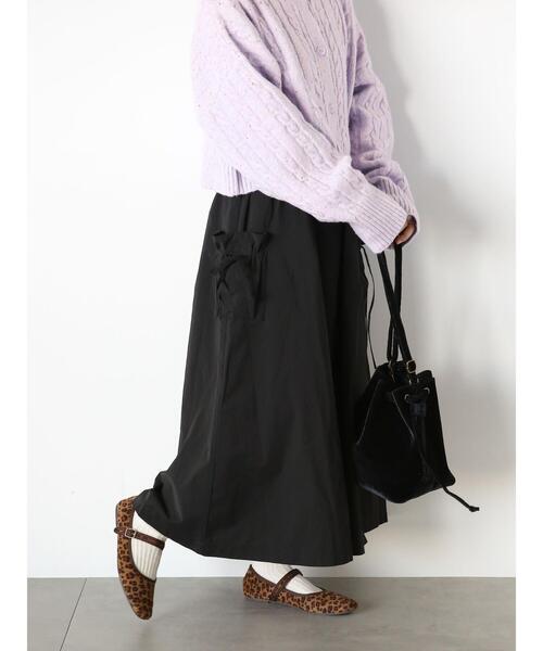 リボンを結んだギャザーポケットが可愛らしいスカート。 ふんわりと広がるボリュームフレアなシルエットで、可愛らしい印象を演出してくれます。 後ろゴムギャザー仕様で安心感があり、穿き心地もノンストレス。 合わせるトップス次第でカジュアルからガーリーな着こなしにと、幅広いスタイリングが楽しめる1着です。 ※商品画像は、撮影環境やお客様のご利用のPC・スマートフォンのモニター環境などにより実物と色味に差異がある場合がございます。 【その他採寸】 F ウエスト:[後ゴム仕様]60cm