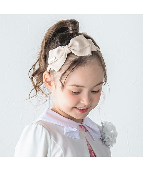 ふんわりと立体的に結んだ大きめのリボンが華やかなカチューシャ。 上品にきらめくラメが可愛らしいデザインです。 シックなネイビーと優しい印象のベージュの2色展開。 新入学や発表会などのシーンにお顔周りを華やかに仕上げてくれるおすすめのアイテム。 お洋服の一部とカラーを合わせるとぐっと統一感のあるコーデになるのも魅力です。 【BeBe(べべ)】 ”LOVE MODERN” 少しおませで、生意気なヨーロピアンカジュアルの提案。 時代性・流行性をとらえ、ベーシックでもワンポイントを施した遊び心、楽しさを盛り込んでいます。 シンプルだけど、こだわりのあるオリジナリティーを重視しています。