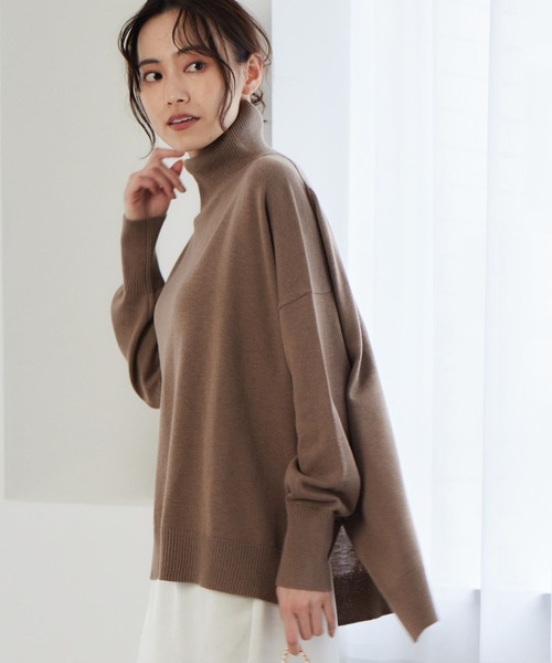 レイヤードも楽しめるしなやかなニットポンチョ ローブのようなワイドシルエットが特徴的なニットプルオーバー。 深く入ったサイドスリットや前後差のあるデザインで、こなれたレイヤードスタイルが楽しめます。 高めのスタンドカラーが首元をやさしく包みこんでくれます。 ゆったりとしたサイズ感で、体型カバーが叶うのも嬉しいポイント。 衿のスリットは折り返してもニュアンスのある衿元にでき、 その日の気分や気温次第で2WAYのような着方も楽しめます。 【スタイリング】 テーパードパンツや、タイトスカート、ジョガーパンツなどの細身のボトムスと合わせたメリハリのある着こなしがおすすめです。 ロング丈のロンTやシャツブラウスとレイヤードさせたスタイルもこなれ感が出てバランスよくきまります。 【素材】 お手入れ方法:ハンドウォッシャブル 滑らかな風合いが特徴のハイゲージのウール混。 キレイめ着こなしにも最適な素材感です。 お買い物をお得にもっと楽しく!上手な活用方法>>> ▼商品のお気に入り登録▼ 完売カラーの再入荷通知や、ラスト1点の通知、プライスダウンしたセール通知も受け取ることができます。 ▼ブランドのお気に入り登録▼ 新作や再入荷等、いち早くブランドのお得な情報を受け取ることができます。 【ご注意】 ※屋外の光や照明の当たり具合で、実際の商品の色味とカラー別画像の色味に若干の違いが発生する場合がございます。 詳細画像と併せてご確認の上、ご注文いただきますようお願い致します。 ※サンプルにて撮影をしておりますので、 実際の商品とは色味・仕様や加工・サイズ等が若干異なる場合がございます。 予めご了承くださいませ。