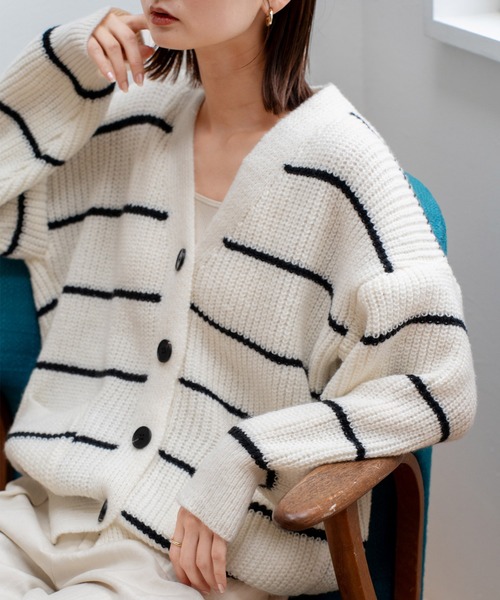 【デザイン】 V字シルエットのボタン付きニットカーディガン! ぱっと目を引くボーダーの配色と あまり組み合わせないようなカラーで 遊び心たっぷりなアイテムに。 程よいゆるシルエット&ボリュームスリーブが こなれた印象にしてくれます。 大きめのボタンとポケットがさりげないアクセントに♪ 気になるヒップ周りもカバーでき 長めの着丈で体型カバーも◎ シンプルデザインでインに着る洋服選びも迷いません! コーデに幅が広がり毎日使いたくなるアイテムです。 【コーディネート】 キャップをポイントで合わせるとラフで お洒落な雰囲気に! フレアパンツやワイドデニムなどと合わせるだけで 大人可愛いコーデに旬な着こなしが完成。 キャミワンピやスカートと合わせてガーリーに、 スマートスタイルなど幅広く楽しんでいただけるアイテムです! …………………… 伸縮性:あり 裏地:なし 透け感:なし 生地の厚さ:普通 前ポケット:あり …………………… ※撮影環境により実際のカラーとやや異なる場合がございます。 画像をご参照の上、ご了承頂けますようお願い致します。 ◆商品のお気に入り登録◆ 完売カラーの再入荷通知や、ラスト1点の通知、 セールの通知も受け取ることができますので、是非ご登録ください。 ◆ブランドのお気に入り登録◆ 新商品や再入荷などの情報を受け取ることができますので、是非ご登録ください。