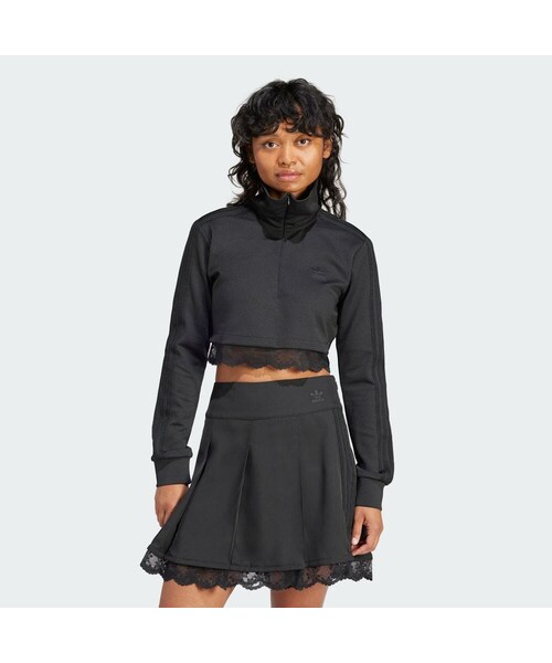裾にリュクスなレースをあしらい、くつろぎ感のあるウェアにちょっとフォーマルな雰囲気を添えた、エレガントなトラックトップ。身体にほど良くフィットする、ソフトなジャカード生地を使用。ハーフジップにリブ編みのカフ、そしてテーラードシャツのような折り襟を付けて、ひと味違う仕上がりに。
