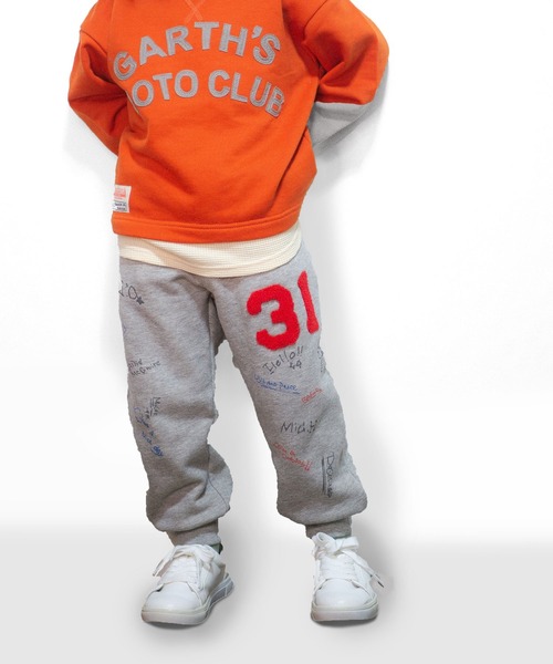 裏起毛素材のジョガーパンツで落書き風のプリントとサガラがシンプル過ぎないデザインになっています。