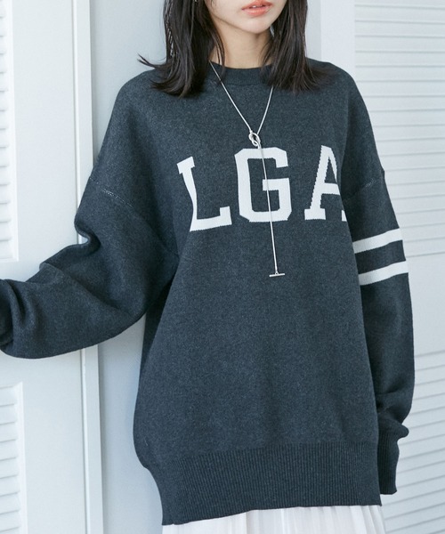 ゆったりシルエットのカジュアルニット!【デザイン・シルエット】 ロゴジャガードのざっくりとしたカジュアルニットです。 <POINT> ・表と裏で糸の色を変えて編んでるので杢調のカラーが可愛いです。 ・ビッグロゴと襟、袖、裾の配色リブカラーがポイント。 ・ヒップの隠れるゆったりとした着丈感も◎ 【素材】 柔らかい着心地の天竺編みニットです。 【カラー】 クールなブラックと可愛らしいピンクの2色展開。 【おすすめのスタイリング】 カジュアルなロゴジャガードニットなので女性らしいボトムスとの相性が抜群です。 Iラインのスカートで縦ライン協調スタイリングか、フレアのスカートで可愛らしくコーディネートしていただくのがおすすめ◎ フレアのパンツ合わせでボーイズライクに着ていただくのも可愛です。 ----------------------------- 裏地:なし 光沢感:なし 透け感:なし 伸縮性:あり 生地の厚さ:普通 季節:春、秋、冬 ----------------------------- 【モデル着用サイズ】 全色モデル身長:155cm、着用サイズ:F ※画像の商品はサンプルです。 実際の商品と仕様、加工、サイズが若干異なる場合がございます。