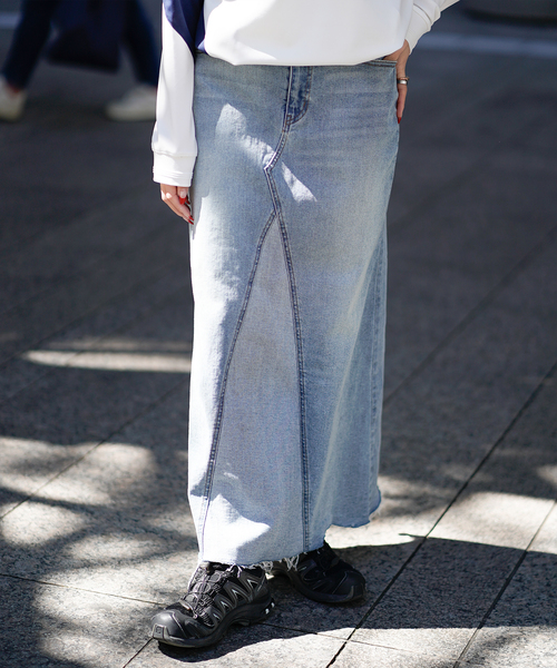 【2024SS】 JOINT WORKS デニムパンツを開いた仕様のアシメトリーなデニムロングスカートは、ヒザ回りを絞った美しいマーメイドシルエットが特徴。 マチの部分を裏面にして生地の色目の濃淡がヴィンテージリメイク風。こだわりストーン加工でヴィンテージ感のある仕上げに。ストレッチデニムな為、ローウエストにする事でよりマキシ丈に合わせられるトレンドなスタイリング◎ 《岡山倉敷デニム生産の生産加工技術について》 こちらの製品は倉敷のデニムファクトリーに依頼しています。岡山はデニムを糸から染色・織り・縫製・洗い加工・仕上げ発送と一貫生産出来る場所、私たちはデニム製品をお客様にお届けするまで、品質を管理をしてきました。現在では海外での生産も加わり幅広く対応いたしていますが、この地で培った技術を基にこれからも皆様に楽しんで頂けるデニム製品を提供してまいります。 ※取り扱いについては、商品についている洗濯表示にてご確認下さい。 ※商品の色味につきまして、お客様のお使いのPCのモニター環境により実際のカラーと画像の色味が違って見える場合が御座います。予めご了承の上、ご注文下さい。 ※店頭・外での撮影画像は光の加減で、実際の商品より明るく見える場合が御座います。商品の色味はスタジオ撮影の画像を参考にして下さい。 モデルサイズ:身長:163cm 着用サイズ:S 本体:洗濯機洗い(弱)