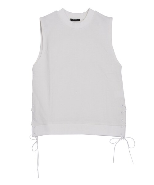 今季らしい裏毛のタンクトップは、サイドのレースアップディティールがカジュアルな中にもフェミニンさを演出。風になびく様なフレアスカートとのコーディネートがおすすめです。