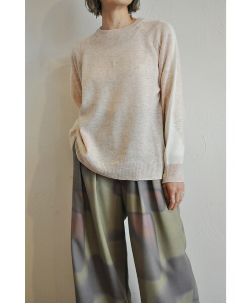 ウール×ナイロンのかさつきのある糸を使用したプルオーバーニットです。 袖に配色のラインがあり、一枚でもポイントのあるアイテムです。 シンプルで使い勝手のいいトップスです。