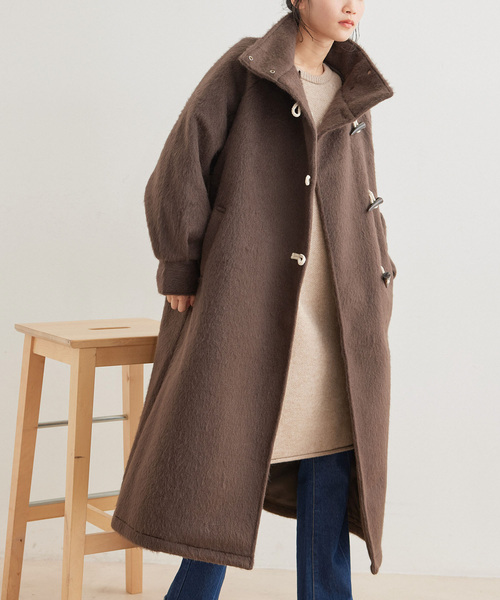 【デザイン・シルエット】 スタンドカラーのロングダッフルコートです。 ラグランスリーブで女性らしく着用できます。 ボタンを全て閉めると首元まで暖かく着用できるのが嬉しいポイント。 起毛感のある素材でオシャレにコーデができる1枚です。 【素材感】 起毛感のあるエステル素材 【カラー】 01クロ 06チャコール 20コゲ茶 【スタイリングポイント】 ロングコートなので、どんなインナーでも合わせていただくことができます。 マフラーがなくても暖かく着用できますが、ボタンを開けてマフラーと合わせてあげるのも◎ 様々なシューズに合わせていただけます。 1枚あると羽織に困らないアイテムです。 裏地:あり 光沢感:なし 透け感:なし ポケット:あり 伸縮性:なし 生地の厚さ:厚手 ボタン:あり その他仕様:トグル 季節:秋冬 ※撮影時の光、お使いのモニター環境によって色の見え方が違う場合がございます。予めご了承ください。 モデル身長:165cm 着用サイズ:F