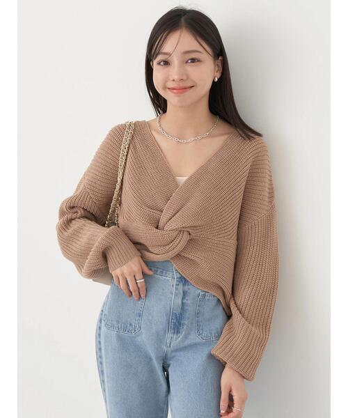 ツイストデザインがポイントになったニット。デコルテの映えるネックラインも、ヘルシーな抜け感をプラス。コンパクトな着丈が腰の位置を高く見せ、脚長効果もアシストしてくれます。ベーシックなカラーで品良くスタイリングでき、愛用率も高まりそうなアイテムです。透け感[やや有り] 裏地[無し] 伸縮性[有り] 光沢感[無し] 生地の厚さ[普通] 付属品[無し] ポケット[無し]●製品寸法:F:バスト57cm 着丈前33/後46cm 袖丈49cm 肩幅51cm 裾幅43cm備考: