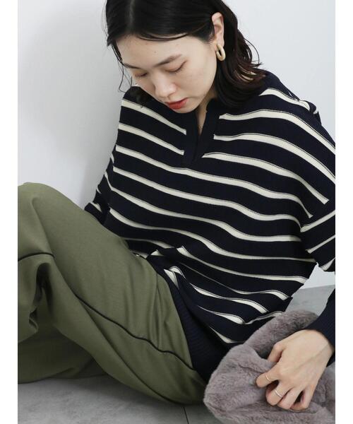スキッパーネックがヌケ感をプラスするニットプルオーバー。 細身のボーダー柄もスタイリングに爽やかなアクセントをプラスします。 ゆったりめのオーバーシルエットで気負いなくスタイリングでき、華奢見せ効果が期待できるのも嬉しいポイント。 カジュアルなデニムやスカートと合わせた綺麗めコーデと、幅広い着こなしが楽しめる1着です。 ※商品画像は、撮影環境やお客様のご利用のPC・スマートフォンのモニター環境などにより実物と色味に差異がある場合がございます。