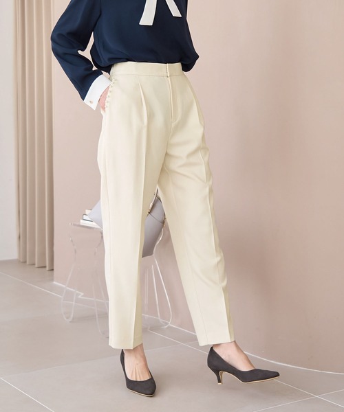 華やぎパンツでホリデーシーズンを盛り上げて。【素材感】・シワになりにくいポリエステル100%。【デザイン・シルエット】・ポケット口にパールビーズを飾った、華やかなテーパードパンツ。・ベルトラインは後ろ側をギャザーにしてラクな穿き心地に。・軽快なアンクル丈で、センタークリースがスマートさをアシスト。【カラー】・オフホワイト、ネイビー、サックスブルーの清涼感漂う3色を展開。【スタイリングポイント】・同シリーズのブラウス(品番:GDH14090)とセットアップで着用可能。・手持ちのニットやジャケットでオリジナルのスタイルを楽しんでも◎。・足もとはヒールパンプスならレディライクに、バレエシューズなら愛らしく決まる。-----------------------------裏地:なし透け感:なし伸縮性:なし生地感・厚さ:普通ポケット:ありウエスト:後ろゴム季節:春・秋・夏-----------------------------※撮影時の光、お使いのモニター環境によって色の見え方が違う場合がございます。※モデル身長:165cm 着用サイズ:38