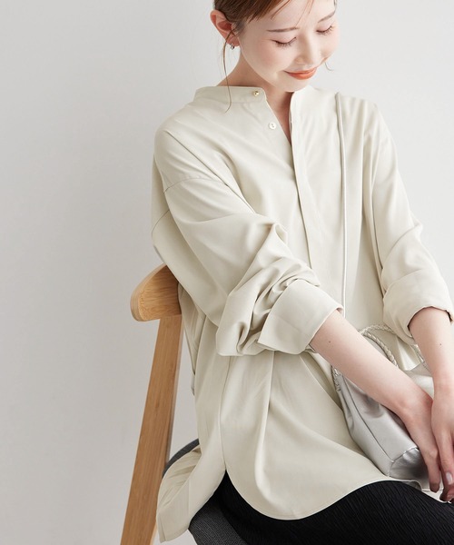 バックシャンな、ブラウスがお目見え。【素材感】 ・easy warm(光吸収発熱)機能の糸を使用。 【デザイン・シルエット】 ・バンドカラーデザインの長袖シャツ。 ・バックヨーク下をプリーツで切り替えた、モードな一枚。 ・ゆったりシルエットで、ボトムアウトしやすいラウンドヘム。 【カラー】 ・オフホワイト、ベージュ、ネイビーのベーシックな3色展開。 ※オフホワイト、ベージュは生地アップの色味をご確認ください。 【スタイリングポイント】 ・シンプルなテーパードパンツでお仕事仕様に。 ・カーディガンを重ねても、後ろ裾からプリーツが覗くと可愛らしい。 ----------------------------- 裏地:なし 透け感:オフホワイト(15)ベージュ系(28)はややあり 伸縮性:なし 生地感・厚さ:普通 その他仕様:ボタンは全て開閉可能 季節:秋~春 ----------------------------- ※撮影時の光、お使いのモニター環境によって色の見え方が違う場合がございます。 ※モデル身長:165cm 着用サイズ:38 : <easy warm(光吸収発熱)> 本製品い使用している生地は、光を効率よく吸収し、熱に変換することで、従来品より暖かくなります。 発熱度合いは、光の当たり方など環境によって変化いたします。