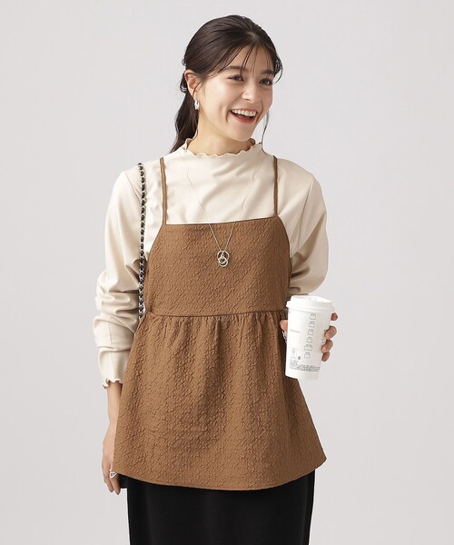 セット商品ですぐコーデが決まる。ジャカードキャミソールとあったかインナーのセット【デザイン】表情豊かな表面感が着映えてくれる、ふくれジャカード素材のキャミソールとインナーのセット!キャミソールは、後ろでリボン結びにしていただく大人可愛いデザインで、肩ひもの長さを調整できるのも嬉しいポイント。メリハリあるペプラムシルエットはウエスト周りをさりげなく体型カバーしてくれます。ふわっと揺れる裾は印象的で女性らしさを演出してくれます。インナーは、起毛感があり暖かみのあるリブ素材のトップス。首元とお袖口のメロウデザインがトレンドライクな印象です。インナーを変えれば、シーズンレスで着ていただけます。【スタイリング】キャミソールとインナーのセットではもちろん、インナーをタートルネックニットなどに変えての着こなしもおすすめです。(おすすめ商品:C62-17301)また、インナートップスを違うアイテムのインナーとして着回ししていただくのも◎ボトムスは、細身のテーパードパンツや、センタープレス入りのワイドパンツと合わせるとバランスよく着こなしていただけます。【素材】キャミソールは、表面感豊かなふくれジャガードのブラウス素材。インナーは、起毛感のある暖かみのあるジャージ素材。モデル情報:身長164cm B78 W56 H80 着用サイズ:02(M)店舗へのお問い合わせ商品番号:741-18312●製品寸法:02(M):キャミソール着丈40cm キャミソールB82cm インナー着丈61cm インナーB94cm インナー袖丈62cm インナー肩幅38cm03(L):キャミソール着丈41cm キャミソールB86cm インナー着丈62cm インナーB95cm インナー袖丈63cm インナー肩幅38cm04(LL):キャミソール着丈43cm キャミソールB90cm インナー着丈63cm インナーB96cm インナー袖丈64cm インナー肩幅38cm備考: