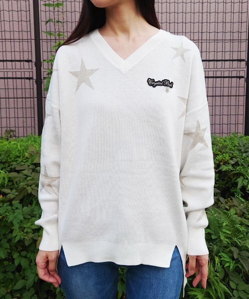 長め丈の美シルエットニット【星柄ニット☆】ラメ入りの星柄がかわいいVネックプルオーバーニットです。オーバーサイズデザインですが落ち感のある素材なので野暮ったくならずスタイルUPにも◎深すぎず浅すぎないVネックはフロントもバッグもVになっていてバックスタイルも凝ったディティールになっています。お尻が隠れるくらいの絶妙丈です。デニム系はもちろん、ペンシルスカートやストンとしたスカートの他ワンピースのうえからかぶってもかわいいフォルムのニットです。