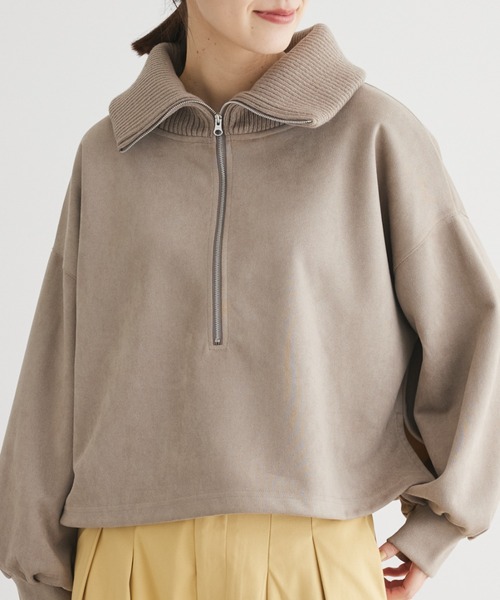 肌触りの心地よいスエードポンチ素材で仕立てたハーフZIPプルオーバー。 ネックはリブの異素材切り替えでメリハリ感をプラス。ふっくらとしたボリュームのあるスリーブも可愛らしいポイントです。 合わせるボトムス次第で、カジュアルにも綺麗めにもスタイリングが楽しめる1着。 透け感[無し] 裏地[無し] 伸縮性[有り] 光沢感[無し] 生地の厚さ[普通] 付属品[無し] ポケット[無し] ●製品寸法: F:バスト60cm 着丈52cm 袖丈47cm 肩幅64cm 裾幅59cm 備考: