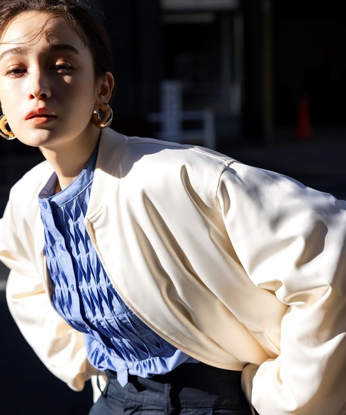 定番MA-1が女性らしいシルエットで登場!【デザイン・シルエット】 ふっくらとしたシルエットの袖のボリューム感が魅力的なブルゾンです。 <POINT> ・サイドにゴムドロスト入りでクシュっとデザインポイントになっています。 ・程よい薄手の中綿入り。 ・つや感のある素材で女性らしいデザイン。 ・ヒップが隠れる安心感のある着丈も魅力。 【素材】 程よくつや感のある素材感。 中綿入りで季節の変わり目にぴったりです。 【カラー】 ベーシックなブラック・柔らかなキナリ・女性らしいピンクの3色展開。 【おすすめのスタイリング】 カジュアルスタイルにはもちろん、スカートやミニ丈ボトムと合わせて女性らしさをプラスするのもおすすめ ----------------------------- 裏地:なし 光沢感:あり 透け感:なし 伸縮性:なし ファスナー:あり ポケット:あり 生地の厚さ:やや厚手 季節:春、秋 ----------------------------- 【モデル着用サイズ】 メイン着用モデル身長:170cm、着用サイズ:F 詳細モデル身長:155cm、着用サイズ:F ※画像の商品はサンプルです。 実際の商品と仕様、加工、サイズが若干異なる場合がございます。