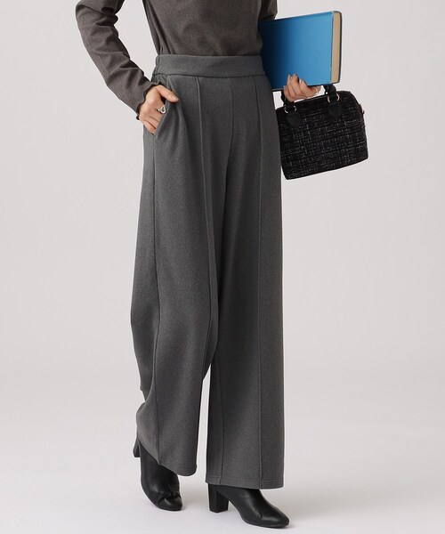 のびのびストレッチで快適な着心地のピンタックワイドパンツ 【デザイン】 女性らしさとカッコ良さを併せ持つワイドパンツ。 カジュアルすぎない、リラックス感のあるシルエット。 センターにあしらったピンタックがスラリと脚長効果を発揮してくれます。 ウエストの後ろ部分はゴム入りでフィット感のある穿き心地です。 【スタイリング】 センター部分のピンタックデザインが脚をすっきりと見せてくれるので、 オーバーサイズのニットやスウェットともバランスよく着ていただけます。 ハイゲージのニットや薄手のトップスをタックインしてウエストを見せるとより脚長効果が期待できます。 タックインする際は上からざっくり編みのカーディガンなどを合わせていただくと、 ヒップや太もも周りをカバーしてくれます。 【お客様からいただいたコメント】 すごくいい! 試着で足を通した瞬間、すごく穿きやすくてビックリしました。 柔らくて暖かくて穿いていて気持ちいいです。 きっちりして見えるけどスウェットを穿いているのかと思うくらい楽です。 (身長:162センチ 体型:ふっくら チャコールグレー014カラーのLサイズ購入) とのお声を頂戴しております。 【素材】 もちもちと伸縮性がありながら、なめらかでとろけるような肌さわりのジャージ素材。 起毛素材を使用しており暖かい穿き心地。おうち時間にも楽に穿いていただけるアイテムです。 モデル情報:身長164cm B78 W56 H80 着用サイズ:02(M) 店舗へのお問い合わせ商品番号:741-68006 ●製品寸法: 02(M):W64~74cm H88cm 股下69cm 前股上34cm 渡り幅31cm 裾幅25cm 03(L):W69~79cm H93cm 股下70cm 前股上34cm 渡り幅32cm 裾幅26cm 04(LL):W74~84cm H98cm 股下71cm 前股上35cm 渡り幅33cm 裾幅28cm 備考: