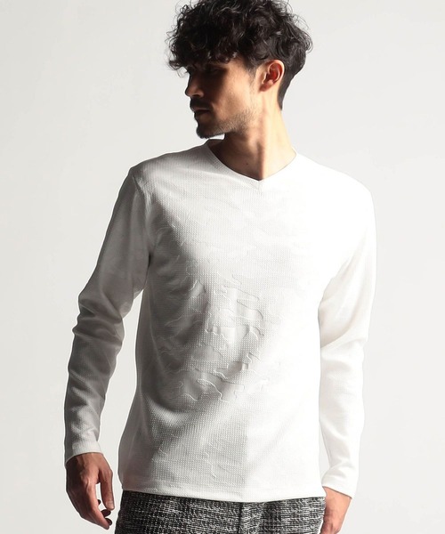 ■デザイン身頃・袖にカモフラ・クラック柄のエンボス生地、細腹パ-ツにエンボスなしの生地を切替えに使用することで、視覚的ギミックと着用時の立体的なフォルムを演出しています。■サイズほどよいリラックスフィットで着心地抜群。ウエストにやや絞りを入れたシャープなシルエットも魅力です。■素材ストレッチ性のある地柄ブリスタ-ジャカ-ドをベ-スに、カモフラ・クラック柄をエンボス加工しました。合繊の為、軽くて柔らかくスポ-ツウェアの様な快適な着用感が特徴。速乾性と防シワ性にも優れています。伸縮性:あり生地の厚さ:普通加工:エンボス加工