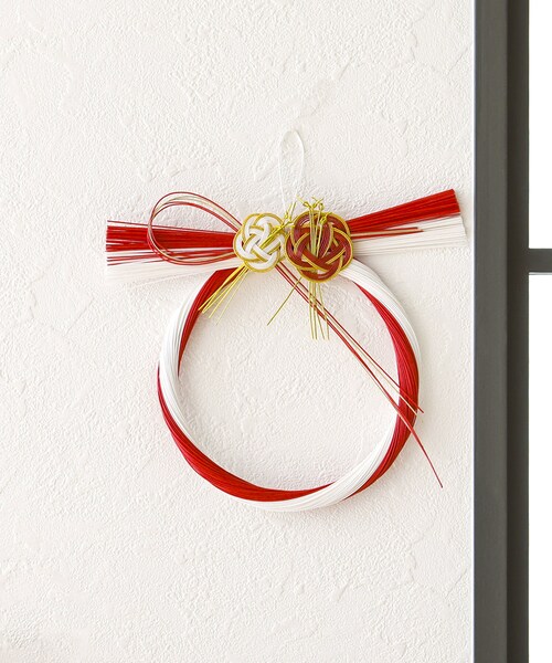 ●神様をお迎えする準備として欠かせないしめ縄飾り。●紅白やゴールドの水引を使用した華やかなデザイン!●紐付きなので、フックなどに掛けて簡単に飾っていただけます。■仕様■サイズ:<ゴールド>約縦36×横16cm <レッド>約縦19×横20cm《ご使用上の注意》●小さなお子様やペットの手の届かない場所で保管してください。●本品は室内装飾品です。安定した場所でご使用ください。●手作りのため、形にばらつきがあります。予めご了承ください。●ご使用の環境により壁や生地などに色移りする場合がございますので十分にご注意ください。●水濡れは変形・変色・割れ・カビ等の原因になりますのでご注意ください。●汚れや水気が付いた場合は、乾いた布等でよく拭き取ってください。●破損の原因となりますので、本品に無理な力を加えないでください。●変形・破損した場合はすぐに使用をおやめください。●直射日光、高温多湿の場所は避けて使用・保管してください。●廃棄の際は、各地方自治体の指示に従ってください。