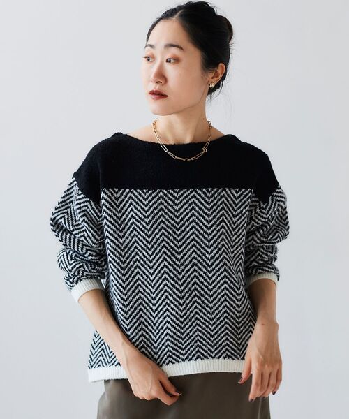 【バイカラーとヘリンボーン柄でメリハリ!】 昨年大人気だったバイカラーのヘリンボーン柄ニットがデザインが新しくなって登場。 首元は女性らしいボートネックデザインでお作りしました。 抜け感が出る様にフロントは丸みのあるカーブデザイン。 素材は、小さなループ感のあるリングヤーンを使用する事で、柄がマットに見えずニュアンスのある仕上がりになっています。 柔らかく軽い着心地で着易いです。 ボトムはパンツもスカートも合わせ易いベーシックな丈バランスでお作りしています。