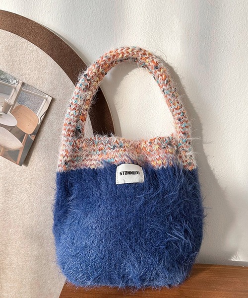 ファーニットで温かみのあるバッグの登場です! 上下が2トーンで分かれていてかわいい! ファーニットの毛羽感が珍しく、コーディネートのワンポイントになります。 丸いシルエットがかわいく、マチも付いているのでしっかり収納もしていただけます。 マフラーなどの小物の色と合わせたり、コートやインナーなどとマッチさせるとコーディネートがまとまりオススメです!