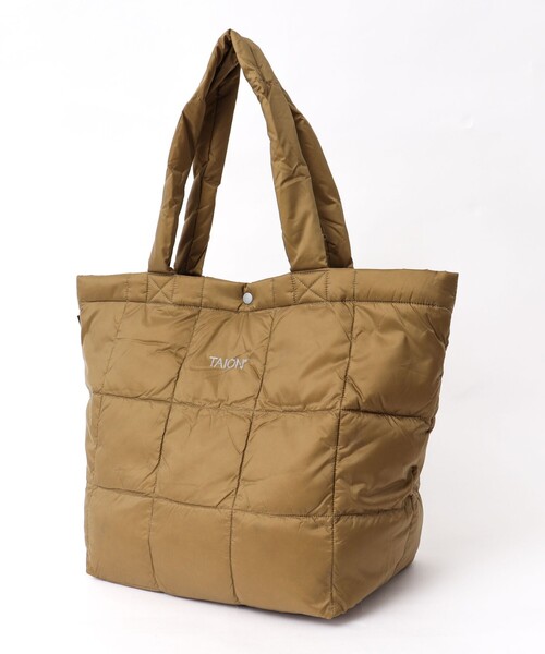 _柔らかく撥水性を兼ね備えた超軽量型ダウントートバッグM_ ダウン特有の軽くて柔らかいフワッとしたボリューム感が特徴で、小さなTAIONロゴの反射プリントをアクセントに、シンプルで飽きのこないミニマムなデザインに仕上げました。ユニセックスでお使いいただけてちょっとしたプレゼントにも最適です。 ダウンの品質は軽くて反発力の良い800フィルパワー以上を使用し、ダウンキルティングは8cmの格子を採用。表地は撥水加工を施した400Tのナイロンタフタ生地、裏地はACコーティングを施したダウンが吹き出しにくい生地を使用しています。(雨具のような撥水ではありません) 表示カラー…メーカーカラー ●ブルー…D.BLUE ●ネイビー…NAVY ●オリーブ…OLIVE ●ベージュ…BEIGE ●パープル…PURPLE ●ブラック…BLACK ●チャコールグレー…D.CHARCOAL メーカー品番:TAION-TOTE02-M 【ATTENTION】 ダウンは天然由来の素材であるため、稀に濃い色の羽が混入することがあり、表面に透けて見える場合があります。 ※こちらは不良品ではありませんので返品や交換につきましてはご対応いたしかねますのであらかじめご了承ください。 【TAION/タイオン】 「TAION」のブランド名の由来は、TAION=体温。“クオリティーに対する圧倒的コストパフォーマンスを通した価値の追求"をスローガンとし、高品質で高機能なインナーダウンを幅広く展開しています。色やサイズの豊富なバリエーションもTAIONインナーダウンの特徴です。 ★気になるアイテムは【お気に入り登録】がオススメです! 入荷情報やクーポン、セール情報が通知されるようになります。 【お取扱い上のご注意】 末永くご愛用頂くために、アテンションタグを必ずご確認の上、着用又はお取り扱い下さい。 ※店頭及び屋外での撮影画像は、光の当たり具合で色味が違って見える場合があります。商品の色味は、スタジオ撮影の画像をご参照下さい。 ※商品画像に関しては出来る限り忠実に表示出来るよう努めておりますが、お客様がご利用のモニターの設定及び特性により、実際の商品と比較し色味に若干の誤差が生じる場合があります。 ※画像の商品はサンプルとなりますので実際の商品と仕様、加工、サイズが若干異なる場合がございます。