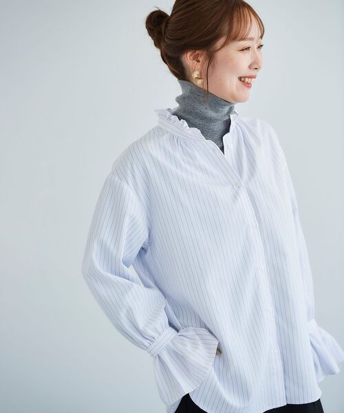 フリル×ギャザーの襟元やベルスリーブの袖口がフェミニンなブラウス。 袖口のフレアカフスは手元を華奢に見せてくれます。 天然タッチで優しい肌触りでありながら、しなやかな反発感とドレープ性を合わせ持つポリエステル混の生地を使用。 シワになりにくく、お手入れもしやすい素材です。 裾のラウンドシルエットはタックアウトでの着こなしも様になります。 マニッシュなパンツ、Iラインスカートとの着こなしから、ジャンパースカートのインに着れば、大人なレイヤードスタイルも楽しめます。 ゆったりとしたサイズ感で細身のパンツとも好相性です。