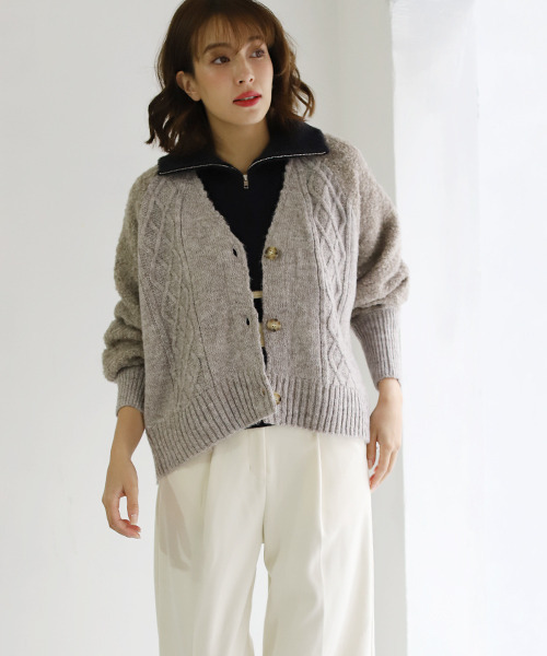 袖に同系色のリングヤーンを使ったVネックワイドカーディガン。 リングヤーンがふっくらとしてウォーム感の高いニットです。 カジュアル感もだしつつ女性らしい雰囲気が魅力のカーディガン。 [サイズ(cm)] M:総丈 前54 後ろ58 バスト140 裄丈86 [お手入れ方法] ドライクリーニングにてお手入れしてください。