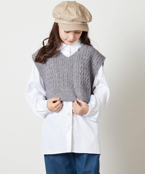 ◆お家で洗えるマシンウォッシャブル◆ 【デザイン】 ・ケーブル編みのショート丈ベストとサイズによって異なるデザインのインナーの2点セットアイテム。 ・(100~130cm)長袖Tシャツのインナーはやや長めで脇スリットがあるので、横から見ても抜け感がありおしゃれ。 ・(140~160cm)襟付きシャツのインナーは袖口にゴムが入っているおしゃれなシャツブラウス。 ・ベストはVネックデザインで首元がすっきりと見えてレイヤードスタイルしやすい。 ・ベストは立体感のあるケーブル編みがほっこりとした印象でかわいいデザイン。 【素材】 ・100~130cmのインナー長袖Tシャツは、綺麗めな表面感のカットソー素材。 ・140~160cmのインナーシャツはシワになりにくい布帛素材。 【スタイリング】 ・ミニボトム×ロングブーツ合わせがトレンド感のあるおしゃれコーデ。 ・パンツと合わせて通学にも使えるカジュアルスタイル。 ・キュロットやミニボトム合わせのガーリーコーデは女の子らしくかわいいコーデ。 ・ニットベスト、ロンTのそれぞれで着回しスタイルも楽しめる。 【カラー】 ・アイボリー…オールホワイトな組み合わせがおしゃれなアイボリー。 ・グレー…シックなグレーがおしゃれでトレンドカラーなグレー。 ---------------- 透け感:無し 裏地:無し 伸縮性:あり 光沢感:無し 生地の厚さ:普通 ---------------- ≪お気に入り登録機能の使い方≫ ■商品のお気に入り登録(ハートマークをクリック) 再入荷通知や値下げ等、お得なご案内を受けることができます。 ※WEB・一部店舗限定販売です。 ※同じデザインの100サイズ/110サイズ/120サイズ/130サイズ/140サイズ/150サイズございます。 100サイズ/110サイズ/120サイズ/130サイズ商品コード:KJFAV74044 140サイズ/150サイズ商品コード:KJFAW74049 ---------------- ※サンプルでの撮影となるため、実際にお届けする商品と仕様やサイズが異なる場合がございます。 ※商品画像は、光の当たり具合やパソコンなどの閲覧環境により実際の色味と異なって見える場合がございます。 商品の色味の目安は商品単体の画像をご参照ください。