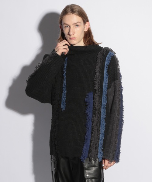 ーーー 配色のフリンジテープが特徴的なデザインニット ーーー point □それぞれ色の異なるフリンジテープをランダムに配置したデザイン。 □毛足の長いフリンジを使用することで表面感ある編地になっていて一枚で様になるアイテム。 □程よい緩さのあるシルエットで一枚でももちろんインナーとしても使用できます。